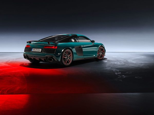 The Audi R8 green hell edition model is numbered consecutively and limited to 50 units worldwide. The model costs EUR 233,949.59 in Germany. This exclusive status becomes apparent at first glance. True to the motto “Green Hell” the outer skin is painted standard in dark Tioman green. As an option, however, customers can also choose ibis white, Daytona gray or mythos black. The front hood, the A-pillars, the roof and the rear end are covered partially in matt black foil with a racing look. The doors of the customer cars feature the edition number in large transparent matt figures reminiscent of starting numbers; the “GREEN HELL R8” logo adorns the sideblade and the windshield in gloss black. The matt black styling package adds highlights to the front end, sills and diffuser, supplemented by sideblades, mirror housings and rear wing in the same tone. The surfaces of the 20-inch wheels in 5-twin-spoke dynamic design are also painted matt black. Red details on the rims round off the striking design.