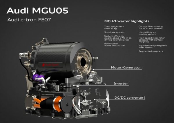 Voor Audi betekent het zevende seizoen in de serie nog een première: de elektrische aandrijflijn van de FE07 is de eerste die volledig in eigen huis werd ontwikkeld. De afgelopen jaren werd de aandrijflijn samen met technologiepartner Schaeffler alsmaar verder doorontwikkeld, maar nu werd er voor de nieuwe MGU-omvormer-eenheid begonnen met een leeg vel papier. Het resultaat is een nieuwe unit onder de naam Audi MGU05, uitgevoerd met een elektrische transmissie met één vaste versnelling, een concept met ingebouwde rotor, magneten aan de buitenzijde, een hoogefficiënt koelsysteem en zes elektrische fases. In vergelijking met de voorgaande aandrijflijn kon er aanzienlijk gewicht worden bespaard, wat heeft geresulteerd in een verbetering van de efficiëntie van de nieuwe MGU. De nieuwe MGU-omvormer-combinatie weegt minder dan 35 kilogram.