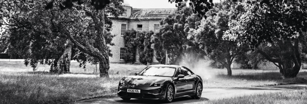 Goodwood Estate. De Britse fotografe Amy Shore ensceneert uiterst zorgvuldig de lichtval en de vormen. Waar anders ’s zomers een bruisend festival de aandacht van bezoekers trekt, ontstaat nu een solo voor twee: Amy en de Porsche Taycan – beeldspraak in zwart-wit.