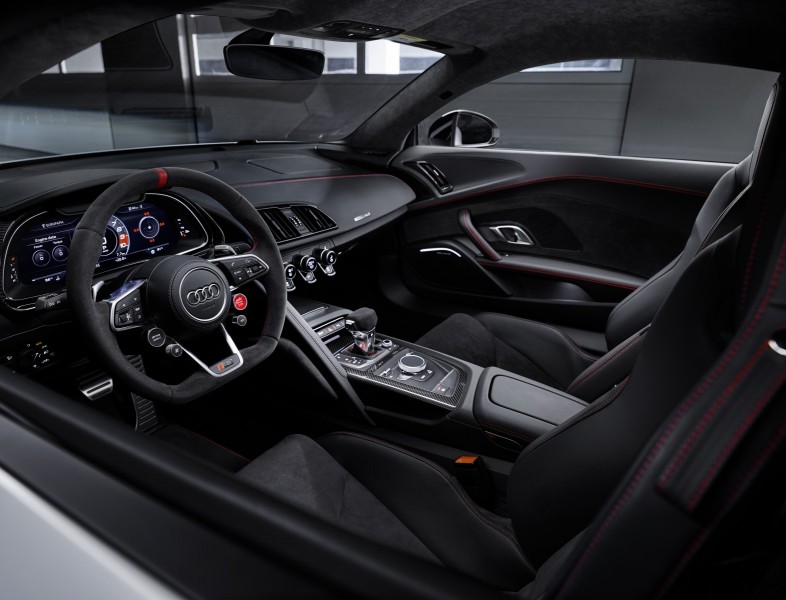 Ook in de auto verwijst Audi Sport GmbH naar de eerste R8 GT uit 2010. Het interieur is uitgevoerd in een combinatie van zwart en rood. De auto heeft rode veiligheidsgordels die eerder exclusief in de R8 GT van twaalf jaar geleden werden toegepast. De vloermatten en de R8-schaalstoelen zijn voorzien van de modelnaam in zwart en rood. Nog een exclusief detail: het specifieke productienummer van elk R8 GT RWD-model is terug te vinden in de carbon inleg van de versnellingspook.