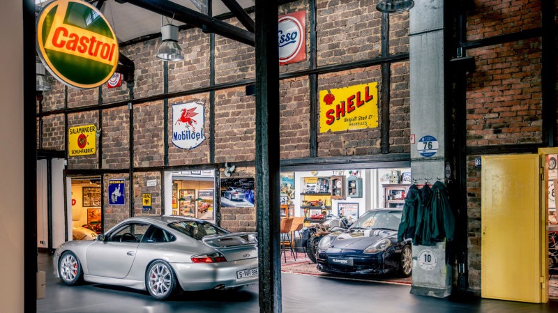 Dat doen we straks. Eerst brengen we wat tijd door op deze bijzondere ontmoetingsplek. We zijn te gast in een mooi ingerichte garage in de buurt van het plaatsje Flacht in Zwaben, bij fans ook wel bekend als de vestigingsplaats van het Porsche Motorsportcentrum. FL8WERK (uit te spreken als ‘Flachtwerk’), zo noemt de vriendenkring van Porsche fans zich die dit particuliere toevluchtsoord met grote passie exploiteert. Oude lichtreclames, reclameposters, flipperkasten, een biljarttafel en veel gezellige zithoeken. “Elk object vertelt een verhaal”, vertelt Timo Conrad, mede-oprichter van FL8WERK en de huidige eigenaar van de voormalige auto van de zaak van Walter Röhrl in Arctic Silver Metallic. Bedachtzaam leidt hij ons langs vitrines met boeken en allerlei automobilia, langs Porsche Zmodelauto’s in alle gangbare schalen en ontelbaar veel foto’s uit het verleden. Bijna elk object vertelt iets over de grote liefde voor het merk. “We organiseren al zo’n tien jaar gezamenlijke ritten, hebben het tijdens het sleutelen graag over technische details en verdiepen ons ook in de geschiedenis van onze speciale sportwagens”, zegt Conrad. “Allemaal pure vrijetijdsbesteding”, aldus de ondernemer. “De meesten van ons zijn in andere branches werkzaam.”